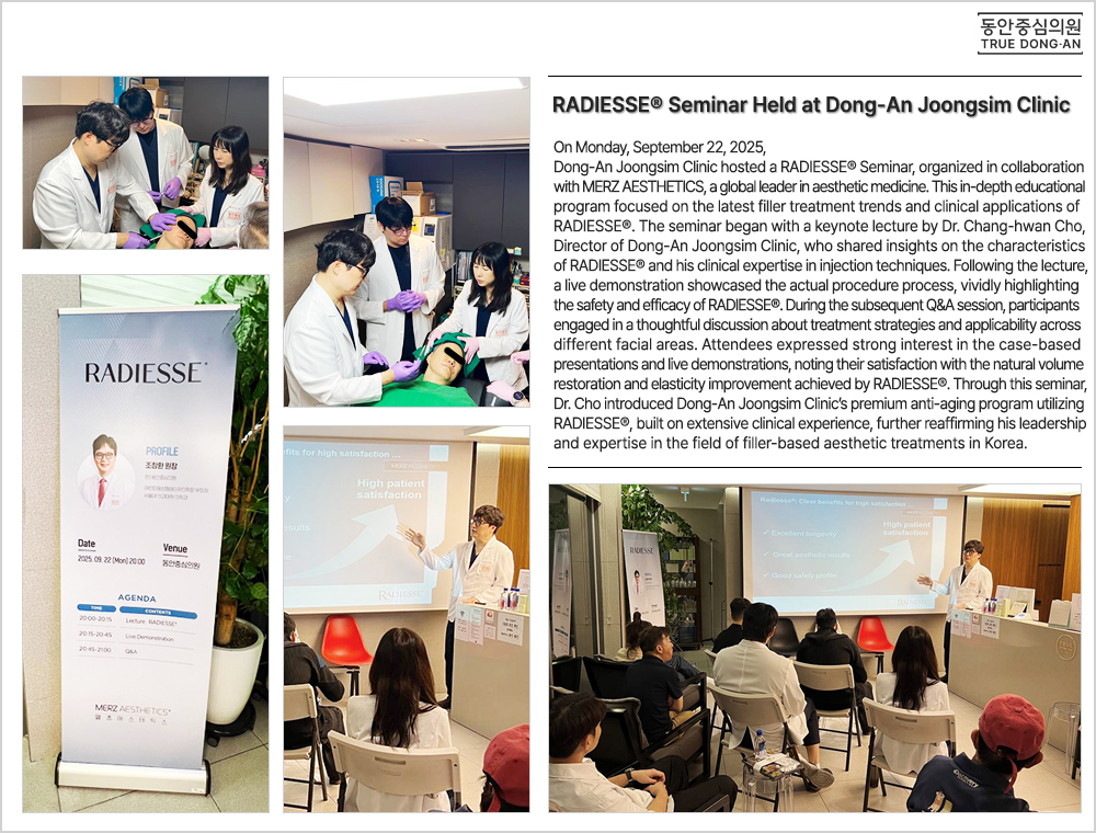 Dong-An Joongsim Clinic hosted a RADIESSE® Seminar, organized in collaboration with MERZ AESTHETICS, a global leader in aesthetic medicine. This in-depth educational program focused on the latest filler treatment trends and clinical applications of RADIESSE®. The seminar began with a keynote lecture by Dr. Chang-hwan Cho, Director of Dong-An Joongsim Clinic, who shared insights on the characteristics of RADIESSE® and his clinical expertise in injection techniques. Following the lecture, a live demonstration showcased the actual procedure process, vividly highlighting the safety and efficacy of RADIESSE®. During the subsequent Q&A session, participants engaged in a thoughtful discussion about treatment strategies and applicability across different facial areas. Attendees expressed strong interest in the case-based presentations and live demonstrations, noting their satisfaction with the natural volume restoration and elasticity improvement achieved by RADIESSE®. Through this seminar, Dr. Cho introduced Dong-An Joongsim Clinic’s premium anti-aging program utilizing RADIESSE®, built on extensive clinical experience, further reaffirming his leadership and expertise in the field of filler-based aesthetic treatments in Korea.