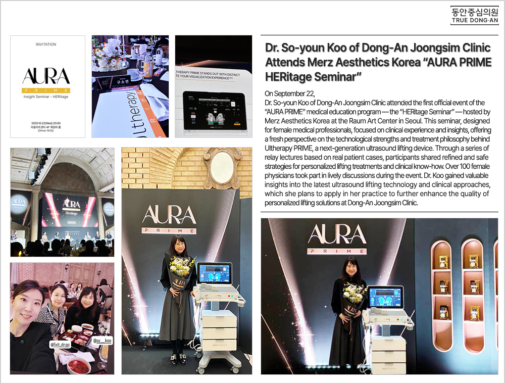On September 22, Dr. So-youn Koo of Dong-An Joongsim Clinic attended the first official event of the “AURA PRIME” medical education program — the “HERitage Seminar” — hosted by Merz Aesthetics Korea at the Raum Art Center in Seoul. This seminar, designed for female medical professionals, focused on clinical experience and insights, offering a fresh perspective on the technological strengths and treatment philosophy behind Ultherapy PRIME, a next-generation ultrasound lifting device. Through a series of relay lectures based on real patient cases, participants shared refined and safe strategies for personalized lifting treatments and clinical know-how. Over 100 female physicians took part in lively discussions during the event. Dr. Koo gained valuable insights into the latest ultrasound lifting technology and clinical approaches, which she plans to apply in her practice to further enhance the quality of personalized lifting solutions at Dong-An Joongsim Clinic. ![]() |