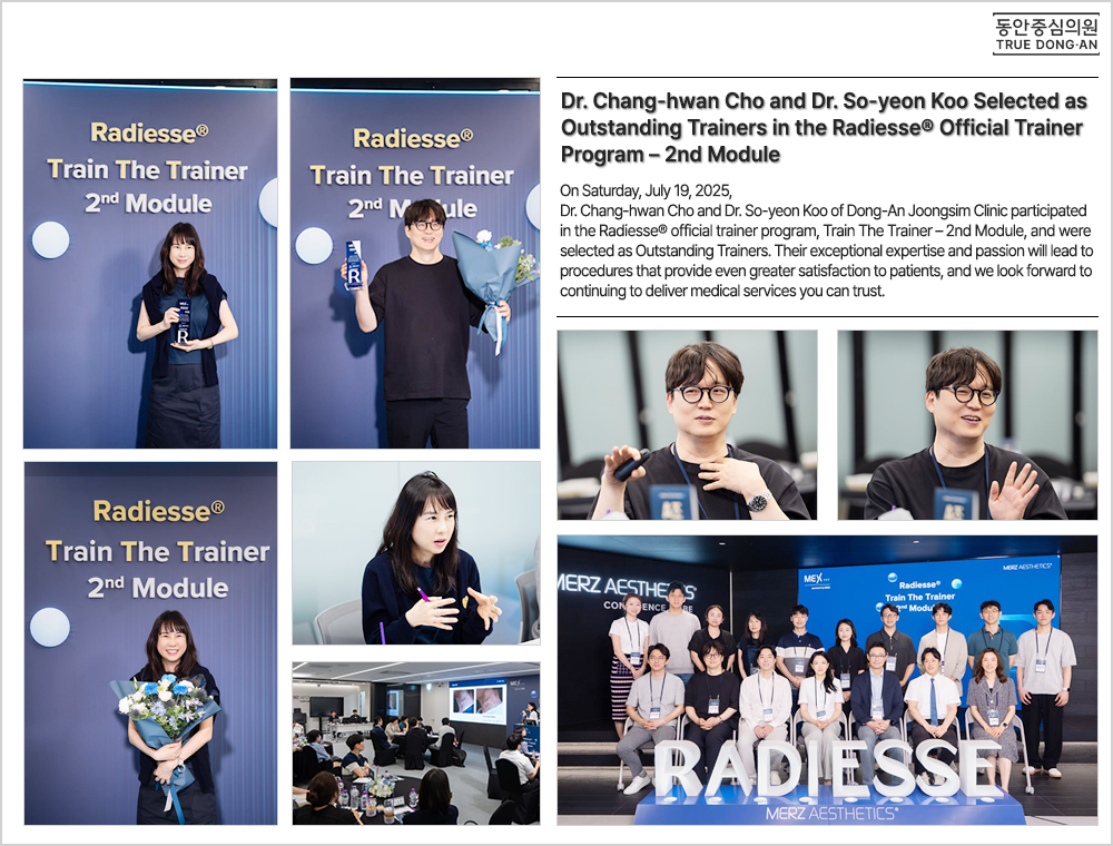 Dr. Chang-hwan Cho and Dr. So-yeon Koo Selected as Outstanding Trainers in the Radiesse® Official Trainer Program – 2nd Module On Saturday, July 19, 2025, Dr. Chang-hwan Cho and Dr. So-yeon Koo of Dong-An Joongsim Clinic participated in the Radiesse® official trainer program, Train The Trainer – 2nd Module, and were selected as Outstanding Trainers. Their exceptional expertise and passion will lead to procedures that provide even greater satisfaction to patients, and we look forward to continuing to deliver medical services you can trust. ![]() |