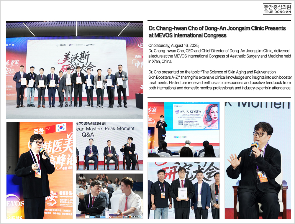 On Saturday, August 16, 2025, Dr. Chang-hwan Cho, CEO and Chief Director of Dong-An Joongsim Clinic, delivered a lecture at the MEVOS International Congress of Aesthetic Surgery and Medicine held in Xi’an, China. Dr. Cho presented on the topic “The Science of Skin Aging and Rejuvenation: Skin Boosters A-Z,” sharing his extensive clinical knowledge and insights into skin booster treatments. His lecture received enthusiastic responses and positive feedback from both international and domestic medical professionals and industry experts in attendance. ![]() |