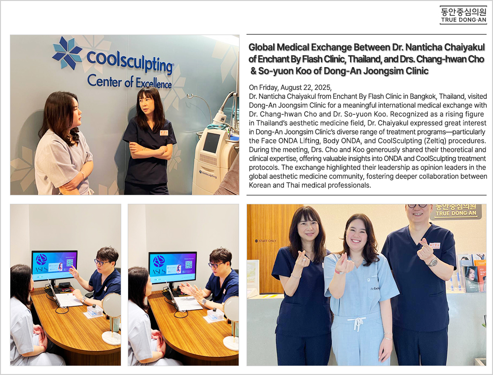 Global Medical Exchange Between Dr. Nanticha Chaiyakul of Enchant By Flash Clinic, Thailand, and Drs. Chang-hwan Cho & So-yuon Koo of Dong-An Joongsim Clinic On Friday, August 22, 2025, Dr. Nanticha Chaiyakul from Enchant By Flash Clinic in Bangkok, Thailand, visited Dong-An Joongsim Clinic for a meaningful international medical exchange with Dr. Chang-hwan Cho and Dr. So-yuon Koo. Recognized as a rising figure in Thailand’s aesthetic medicine field, Dr. Chaiyakul expressed great interest in Dong-An Joongsim Clinic’s diverse range of treatment programs—particularly the Face ONDA Lifting, Body ONDA, and CoolSculpting (Zeltiq) procedures. During the meeting, Drs. Cho and Koo generously shared their theoretical and clinical expertise, offering valuable insights into ONDA and CoolSculpting treatment protocols. The exchange highlighted their leadership as opinion leaders in the global aesthetic medicine community, fostering deeper collaboration between Korean and Thai medical professionals. ![]() |