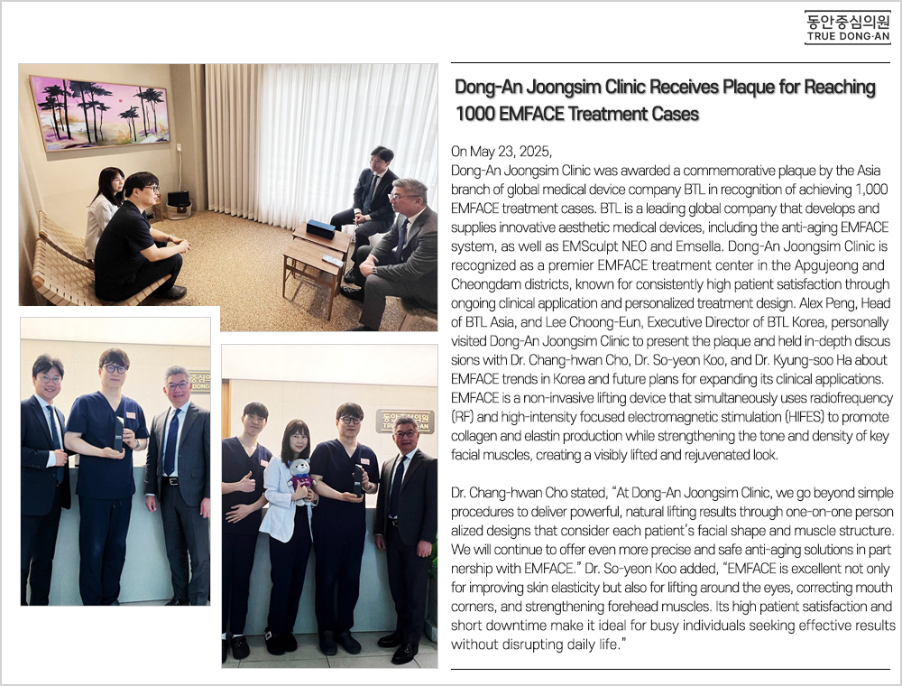 Dong-An Joongsim Clinic Receives Plaque for Reaching 1000 EMFACE Treatment Cases On May 23, 2025, Dong-An Joongsim Clinic was awarded a commemorative plaque by the Asia branch of global medical device company BTL in recognition of achieving 1,000 EMFACE treatment cases. BTL is a leading global company that develops and supplies innovative aesthetic medical devices, including the anti-aging EMFACE system, as well as EMSculpt NEO and Emsella. Dong-An Joongsim Clinic is recognized as a premier EMFACE treatment center in the Apgujeong and Cheongdam districts, known for consistently high patient satisfaction through ongoing clinical application and personalized treatment design. Alex Peng, Head of BTL Asia, and Lee Choong-Eun, Executive Director of BTL Korea, personally visited Dong-An Joongsim Clinic to present the plaque and held in-depth discussions with Dr. Chang-hwan Cho, Dr. So-yeon Koo, and Dr. Kyung-soo Ha about EMFACE trends in Korea and future plans for expanding its clinical applications. EMFACE is a non-invasive lifting device that simultaneously uses radiofrequency (RF) and high-intensity focused electromagnetic stimulation (HIFES) to promote collagen and elastin production while strengthening the tone and density of key facial muscles, creating a visibly lifted and rejuvenated look. Dr. Chang-hwan Cho stated, “At Dong-An Joongsim Clinic, we go beyond simple procedures to deliver powerful, natural lifting results through one-on-one personalized designs that consider each patient’s facial shape and muscle structure. We will continue to offer even more precise and safe anti-aging solutions in partnership with EMFACE.” Dr. So-yeon Koo added, “EMFACE is excellent not only for improving skin elasticity but also for lifting around the eyes, correcting mouth corners, and strengthening forehead muscles. Its high patient satisfaction and short downtime make it ideal for busy individuals seeking effective results without disrupting daily life.” ![]() |